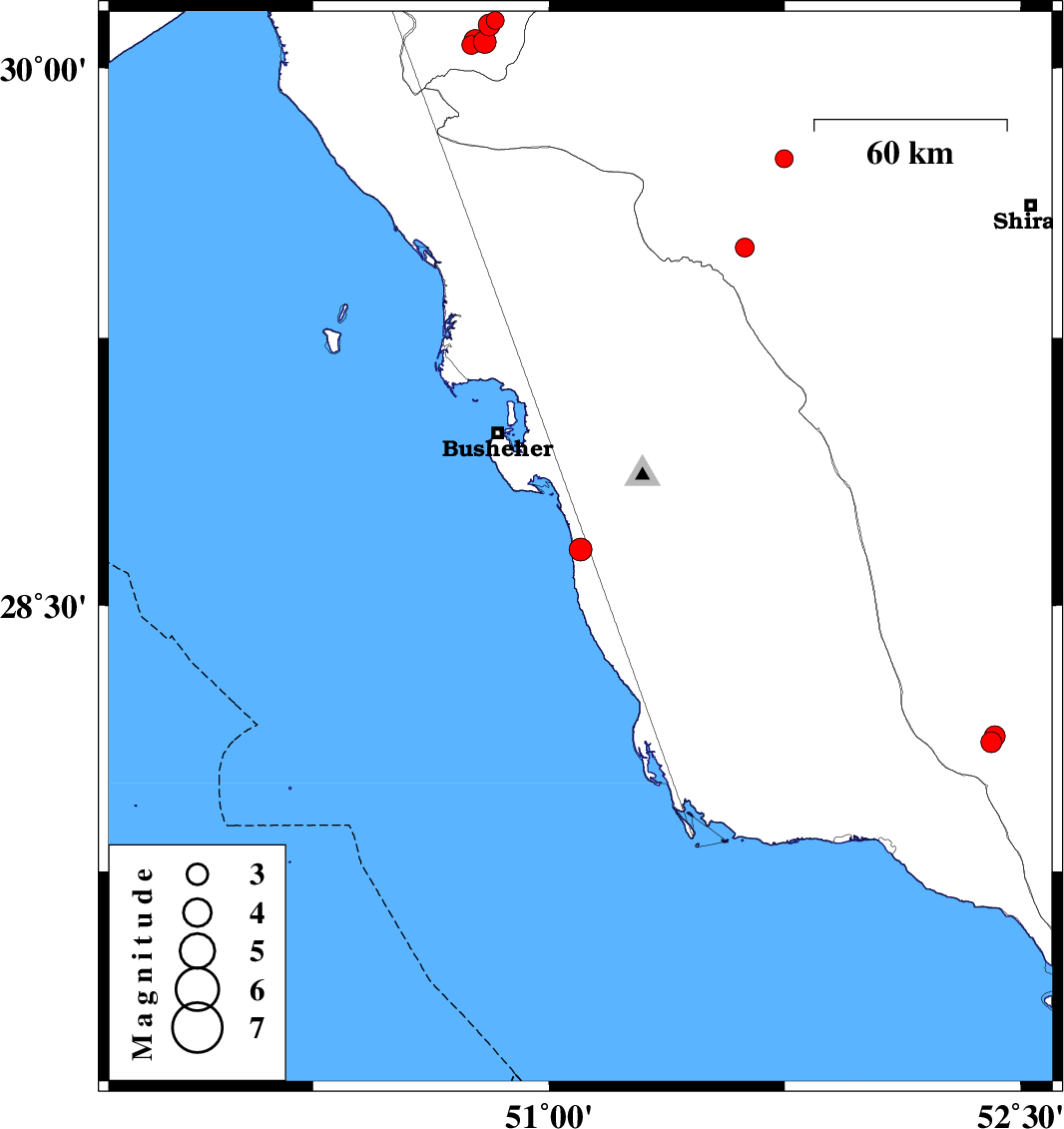 | 2016/08/21 | 16:42:57.9 | 21:12:57.9 | 28.657 | 51.1 | 7 | ML3.2 | Bushehr Province, 26 km -West of Khormog | ||