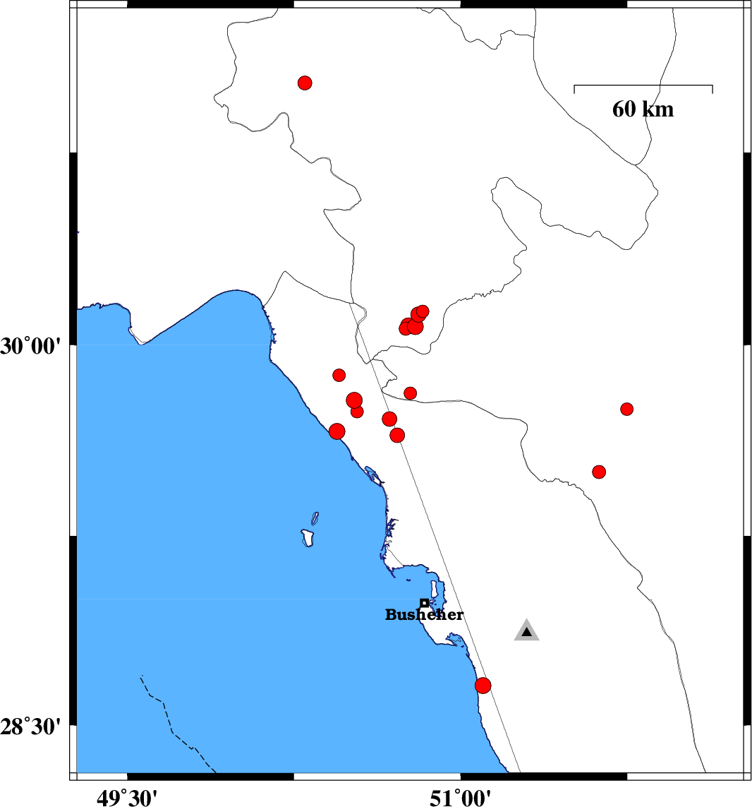2016/08/26 | 17:47:16.0 | 22:17:16.0 | 29.709 | 50.679 | 14 | ML3 | Bushehr Province, 22 km North-East of Bandar-e genaveh | ||