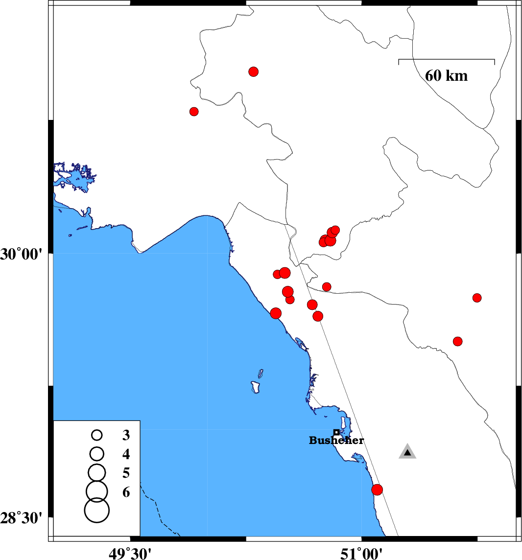| 2016/08/27 | 04:14:06.6 | 08:44:06.6 | 29.811 | 50.773 | 15 | ML2.5 | Fars Province, 36 km North-East of Bandar-e genaveh | ||