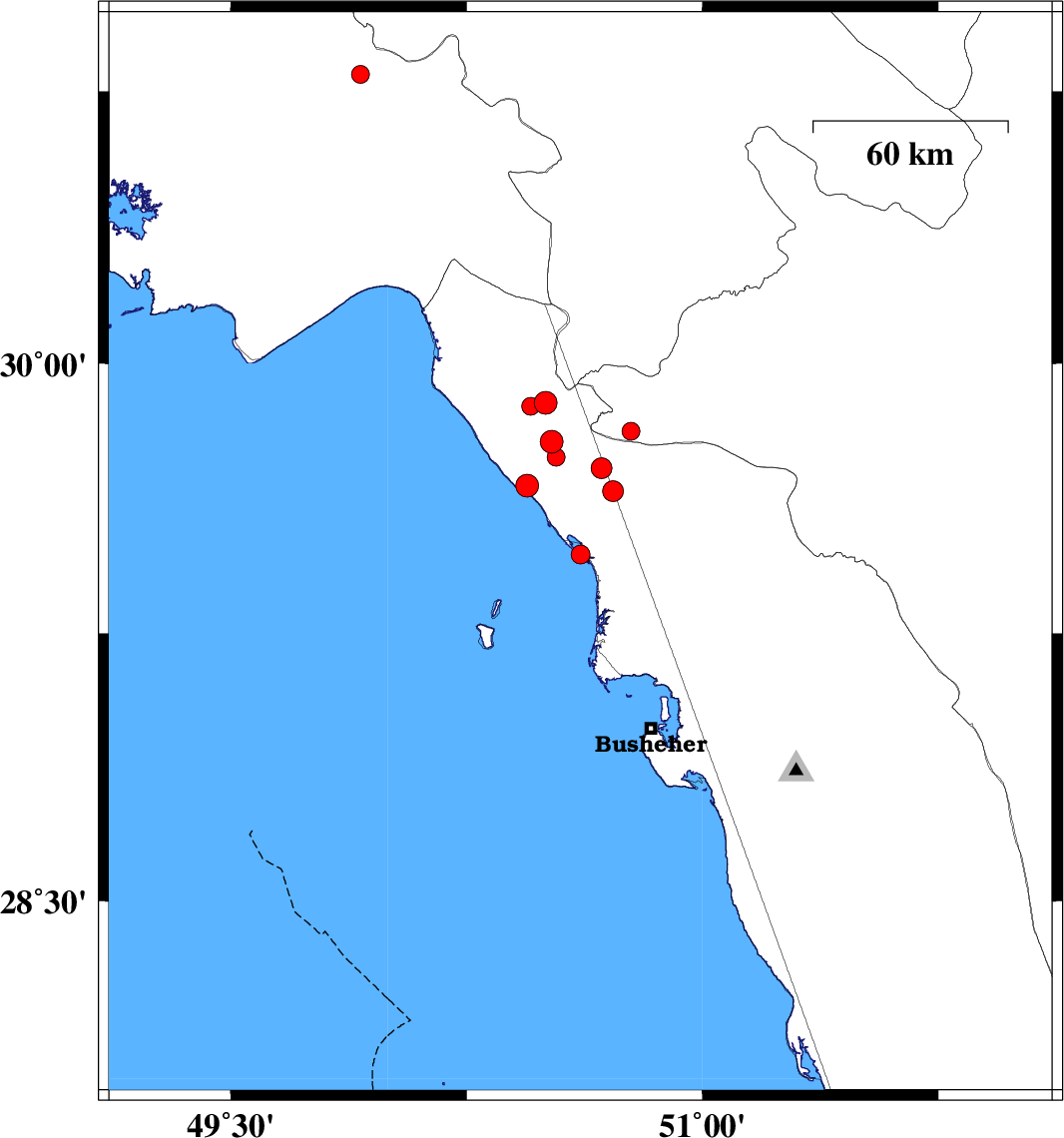 2016/09/01 | 16:47:42.7 | 21:17:42.7 | 29.469 | 50.612 | 6 | ML2.7 | Persian Gulf, 15 km South of Bandar-e genaveh | ||