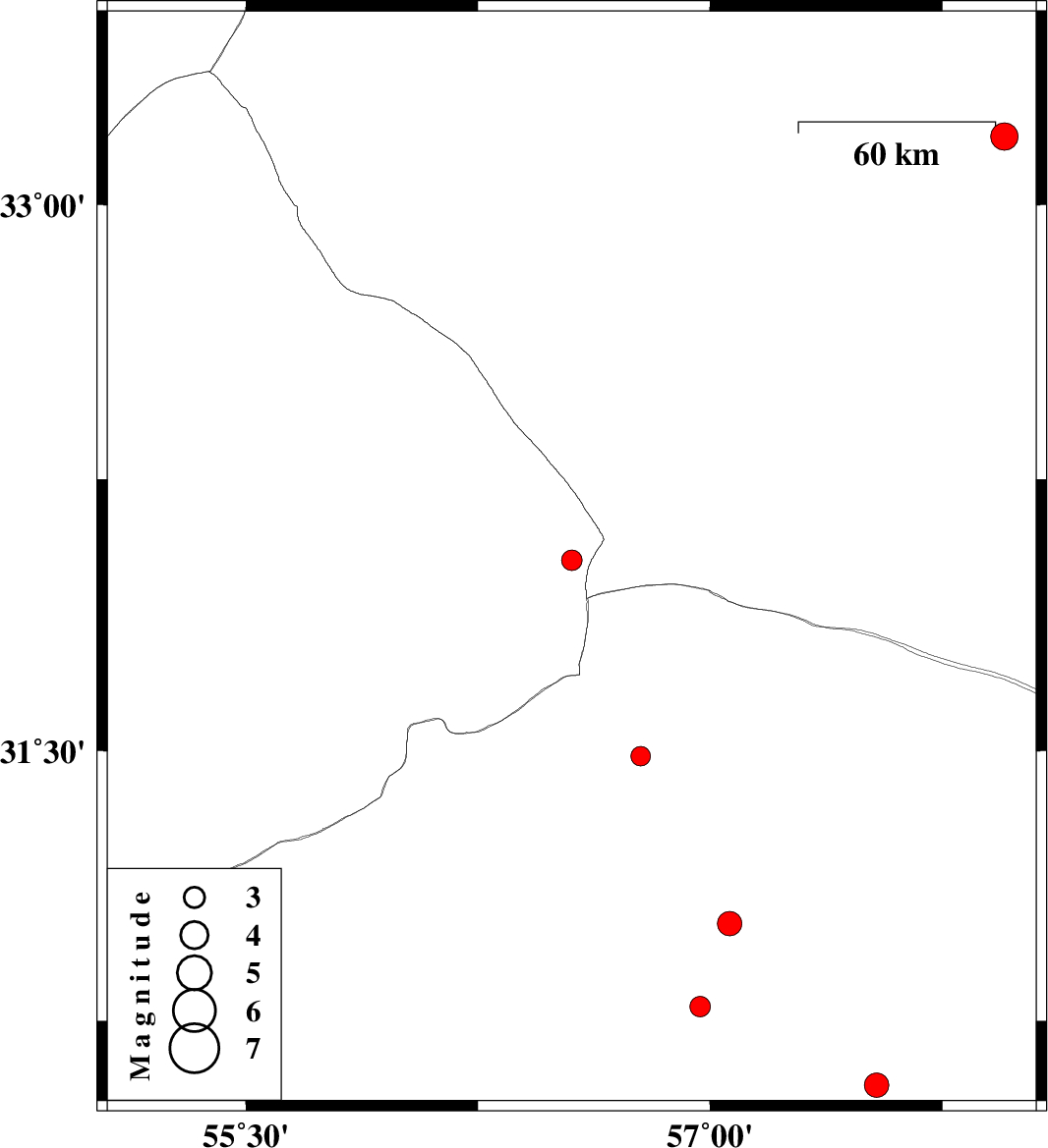 | 2016/08/29 | 00:57:54.9 | 05:27:54.9 | 30.789 | 56.968 | 14 | ML3 | Kerman Province, 38 km -East of Zarand |