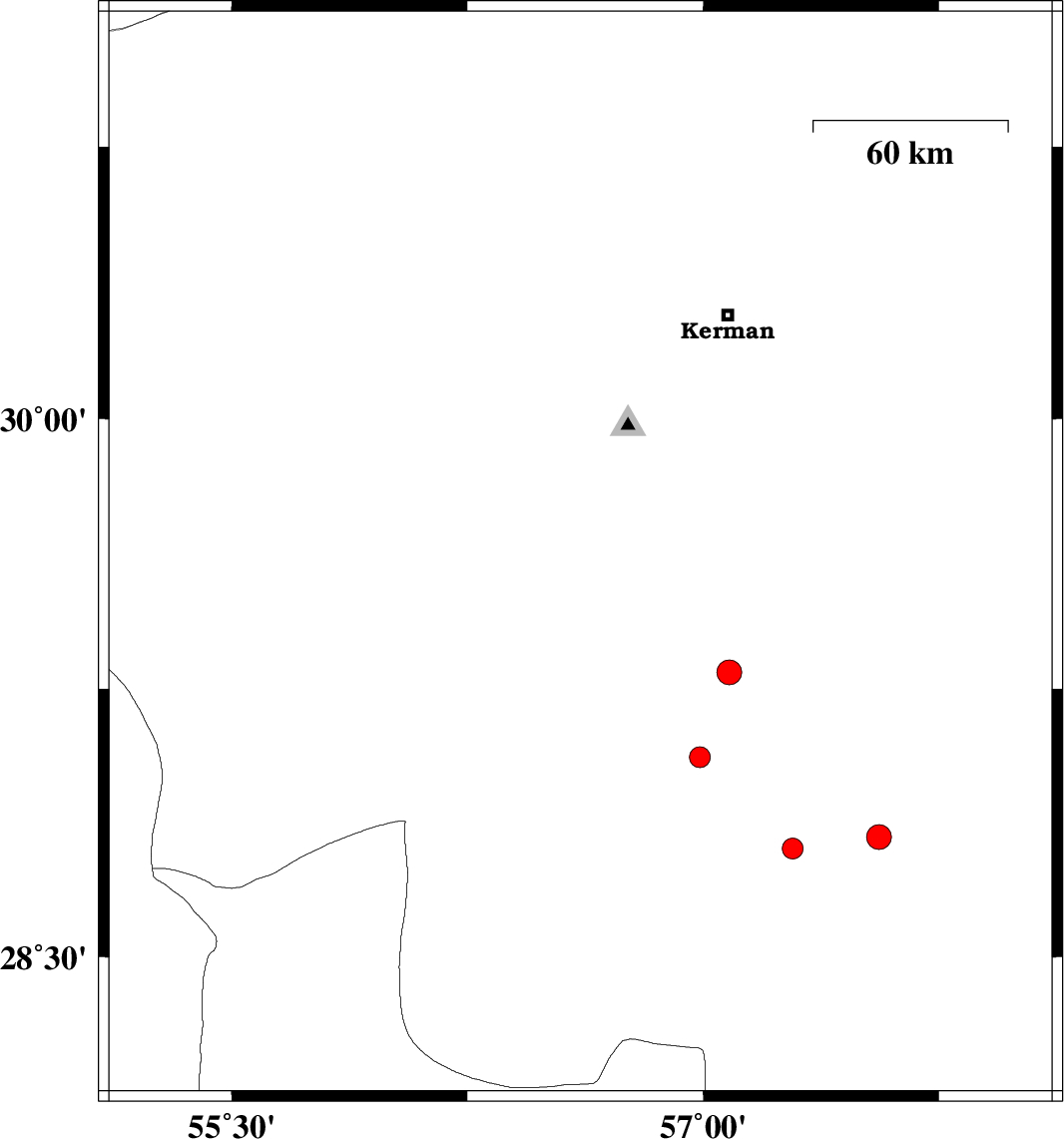 | 2016/08/16 | 15:13:18.9 | 19:43:18.9 | 30.538 | 57.264 | 14 | ML2.9 | Kerman Province, 33 km North-East of Kerman | ||