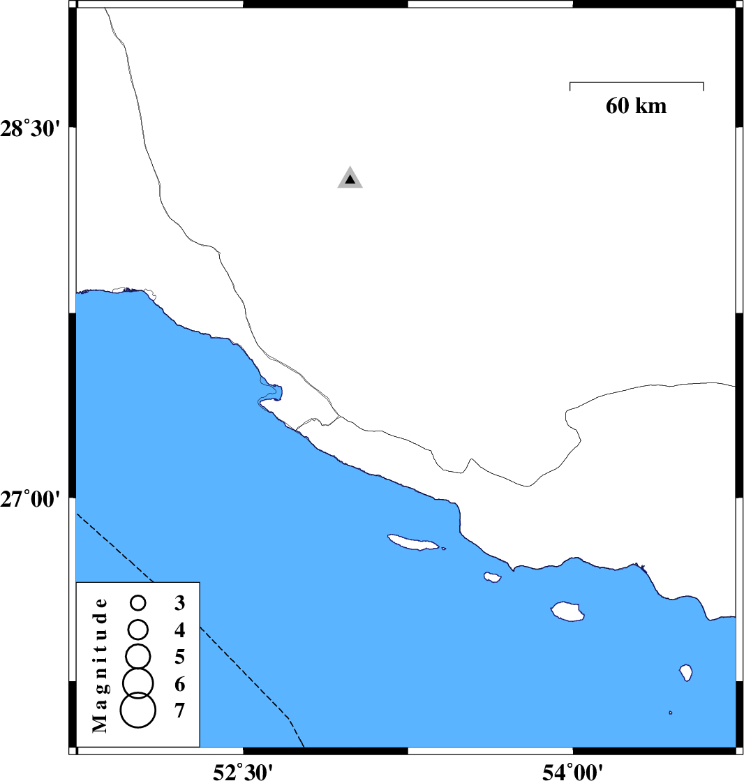 | 2016/09/08 | 19:29:34.1 | 23:59:34.1 | 27.479 | 53.24 | 14 | ML3.2 | Fars Province, 18 km North of Lamerd |