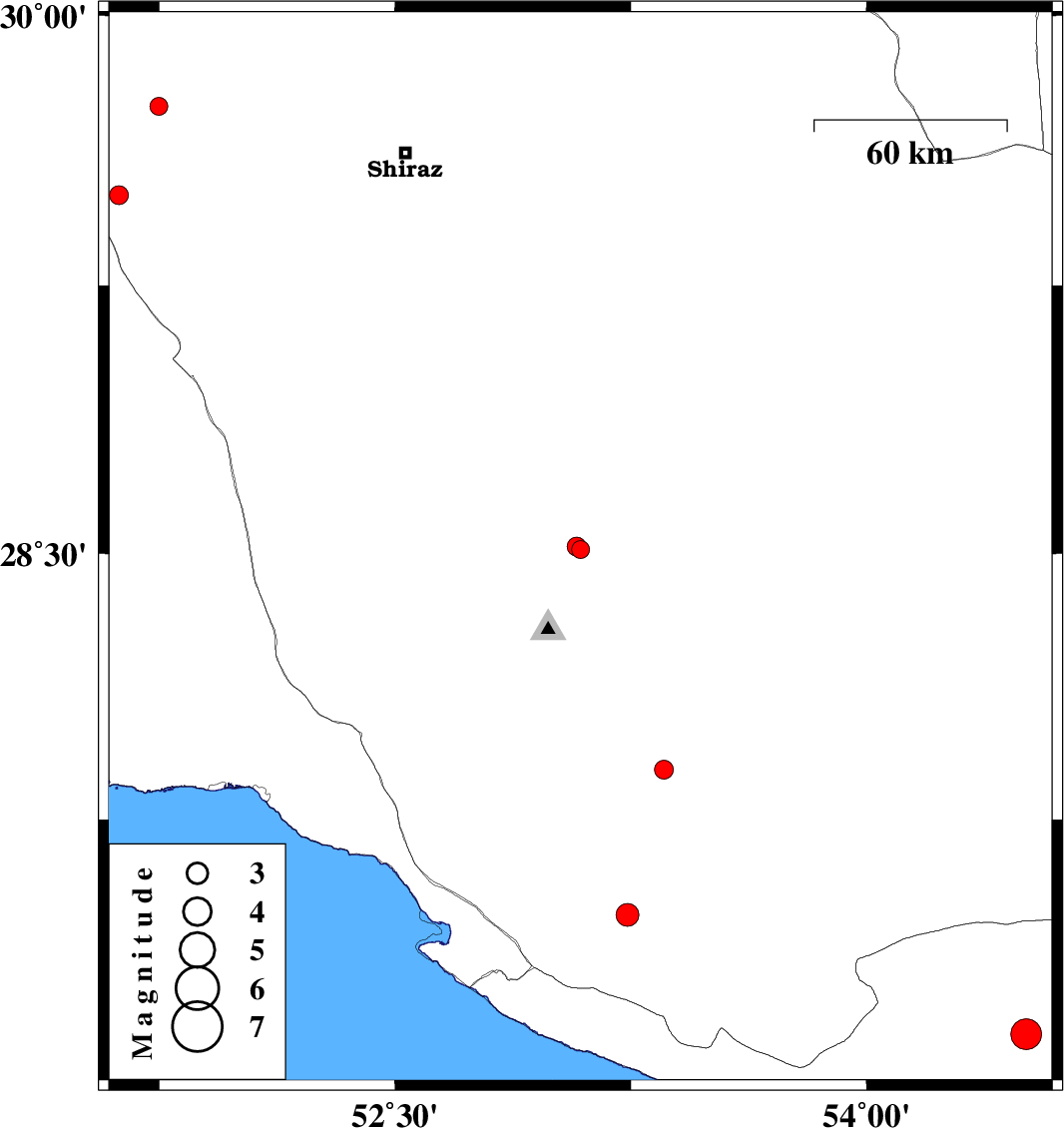 | 2016/08/15 | 00:58:00.3 | 05:28:00.3 | 29.501 | 51.622 | 6 | ML2.7 | Fars Province, 14 km South of Kazerun | ||