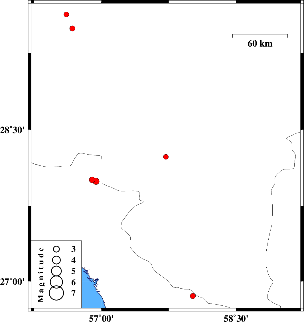 | 2016/09/12 | 13:54:03.1 | 18:24:03.1 | 28.232 | 57.718 | 14 | ML2.6 | Kerman Province, 31 km North of Kahnuj | ||
