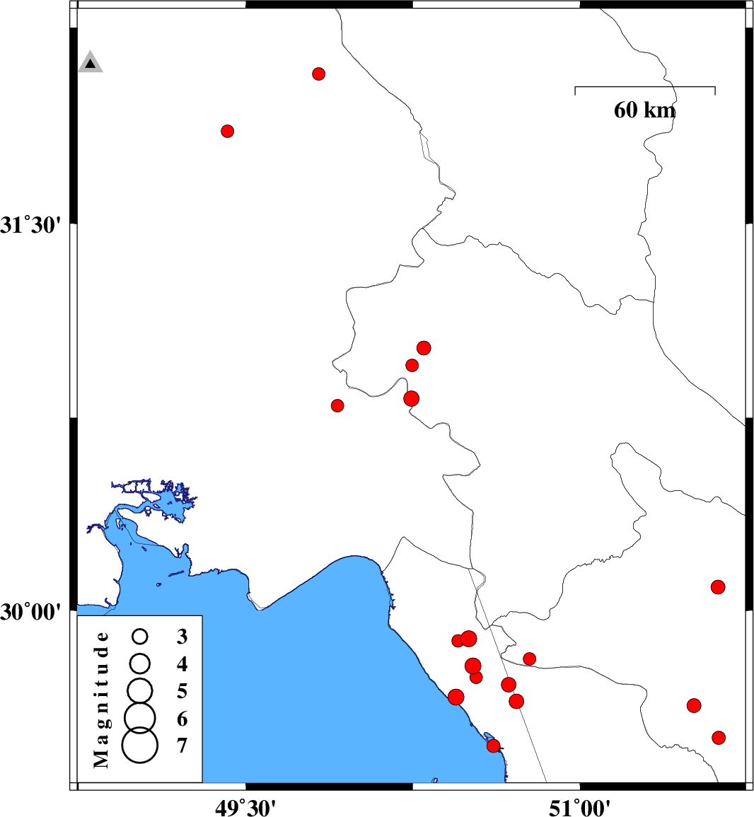 | 2016/08/15 | 00:58:00.3 | 05:28:00.3 | 29.501 | 51.622 | 6 | ML2.7 | Fars Province, 14 km South of Kazerun |