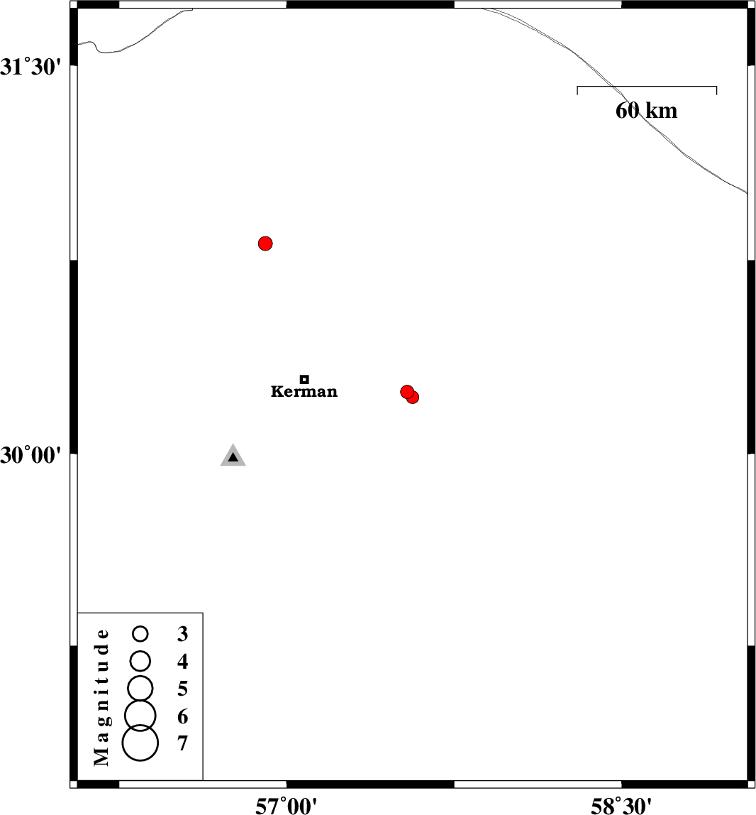 | 2016/09/18 | 11:14:26.1 | 15:44:26.1 | 30.219 | 57.563 | 16 | ML2.6 | Kerman Province, 47 km -East of Kerman | ||