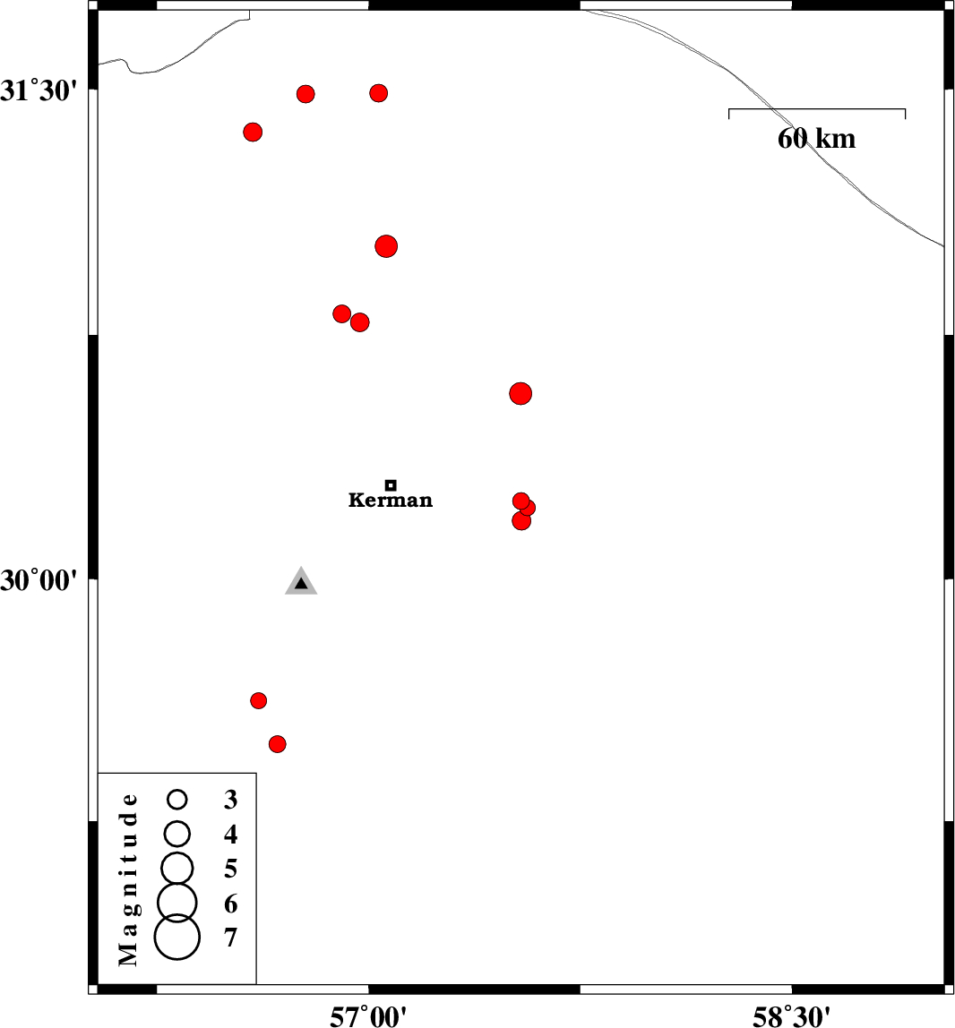 | 2016/09/07 | 09:39:13.3 | 14:09:13.3 | 30.179 | 57.541 | 14 | ML2.9 | Kerman Province, 46 km South-East of Kerman | ||