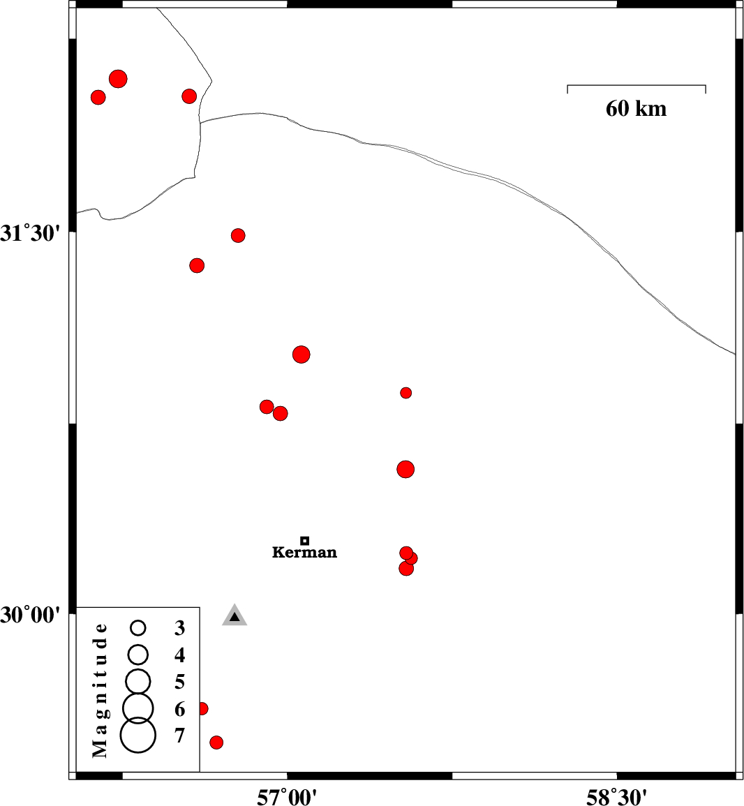 | 2016/09/07 | 09:39:13.3 | 14:09:13.3 | 30.179 | 57.541 | 14 | ML2.9 | Kerman Province, 46 km South-East of Kerman | ||