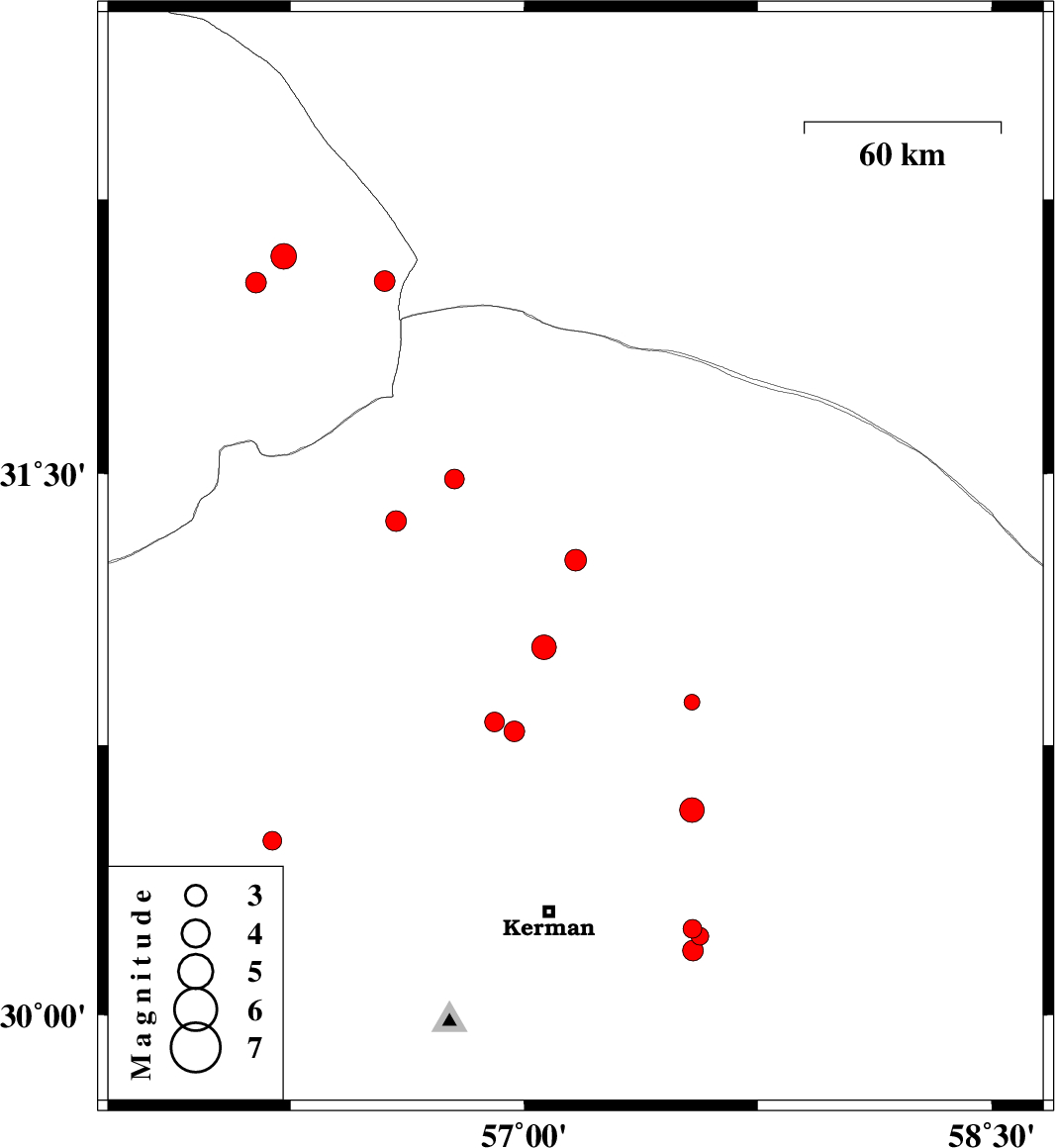 2016/09/07 | 09:39:13.3 | 14:09:13.3 | 30.179 | 57.541 | 14 | ML2.9 | Kerman Province, 46 km South-East of Kerman | ||