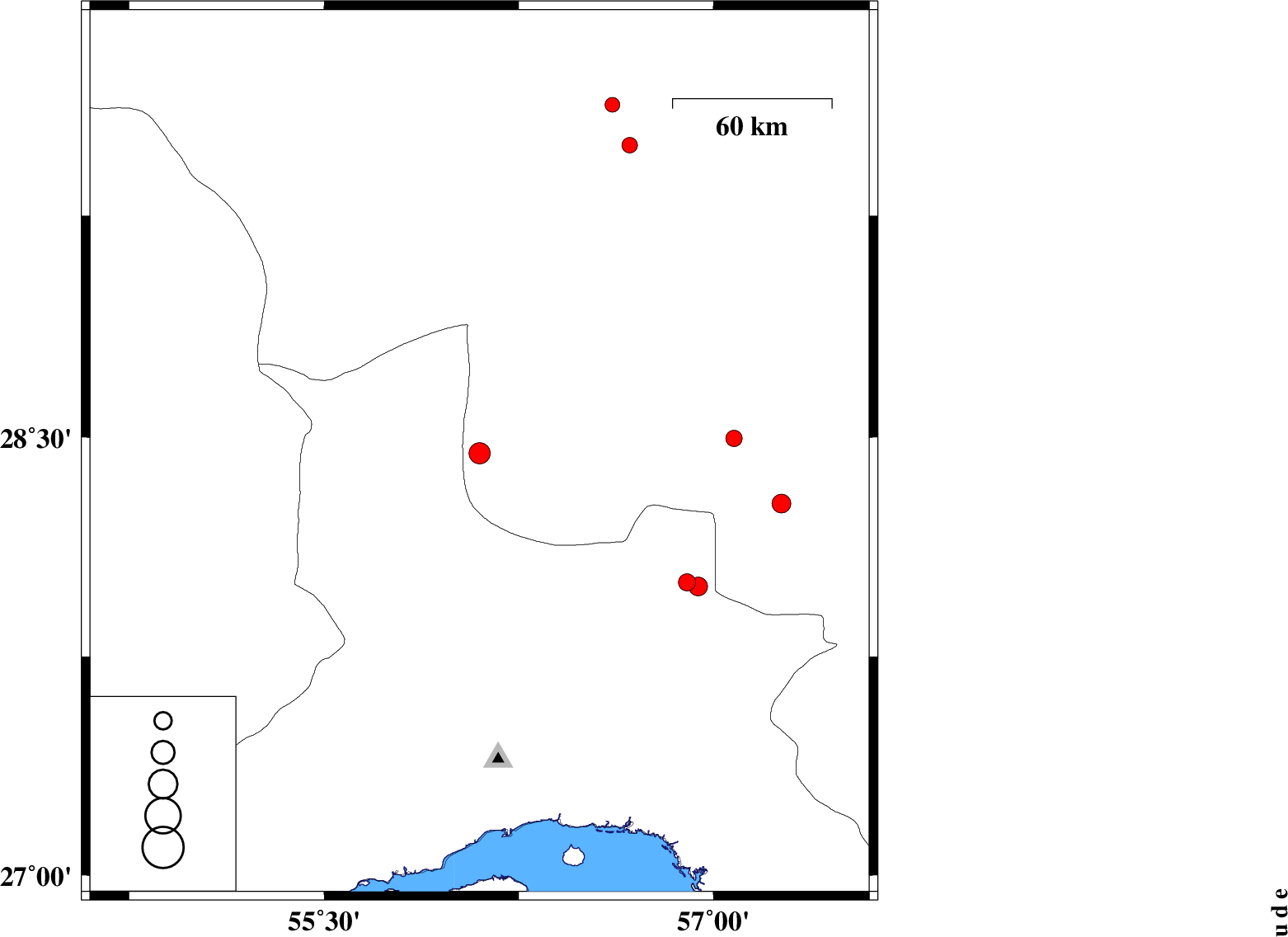 2016/09/03 | 00:09:29.1 | 04:39:29.1 | 28.004 | 56.898 | 15 | ML3 | Hormozgan Province, 78 km -West of Kahnuj | ||