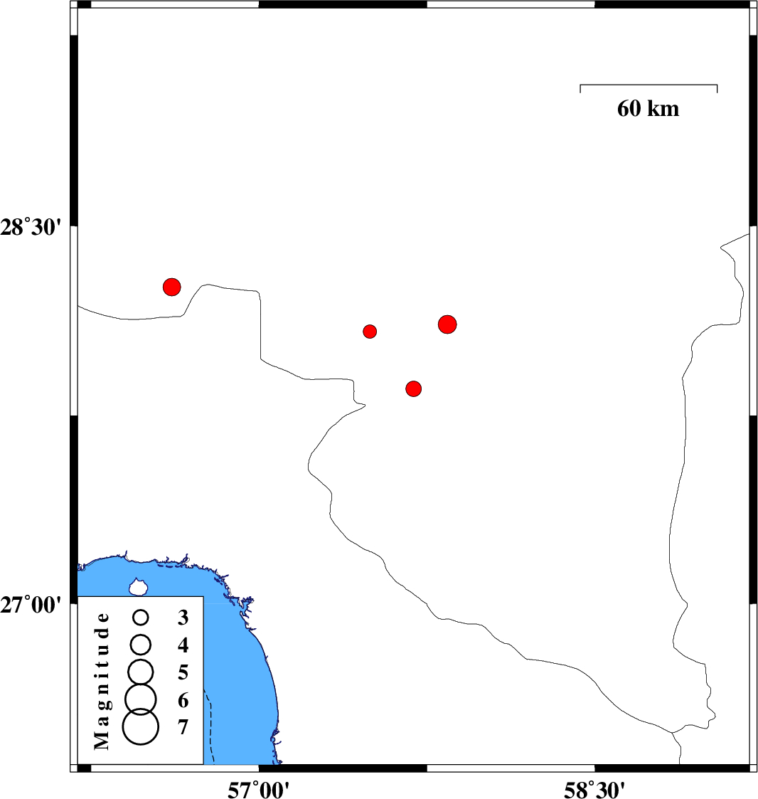 | 2016/10/01 | 04:19:18.8 | 07:49:18.8 | 28.111 | 57.841 | 14 | ML3.6 | Kerman Province, 23 km North-East of Kahnuj |