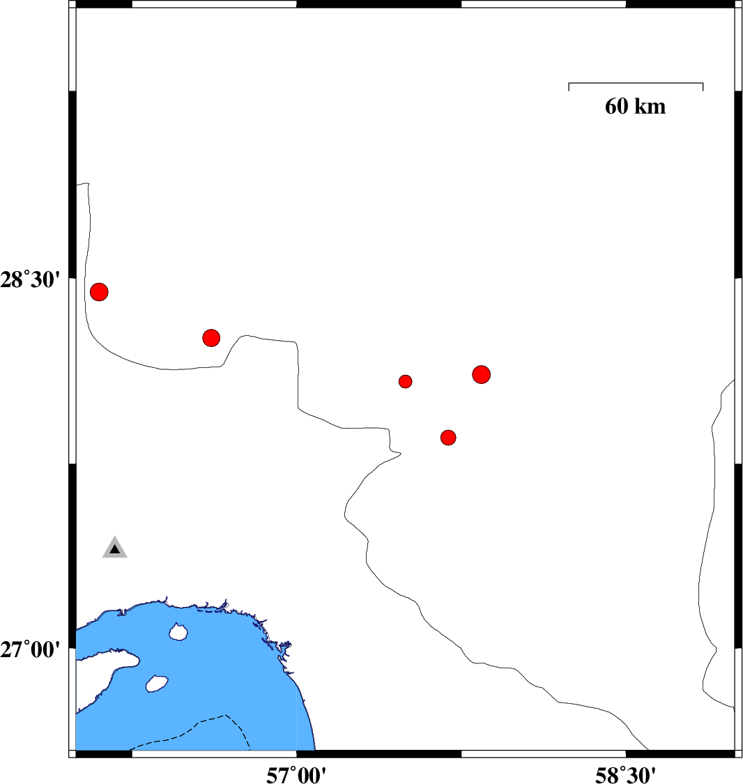 | 2016/09/25 | 20:37:59.7 | 00:07:59.7 | 28.444 | 56.099 | 15 | ML3.6 | Kerman Province, 24 km North-East of Hajiabad |
