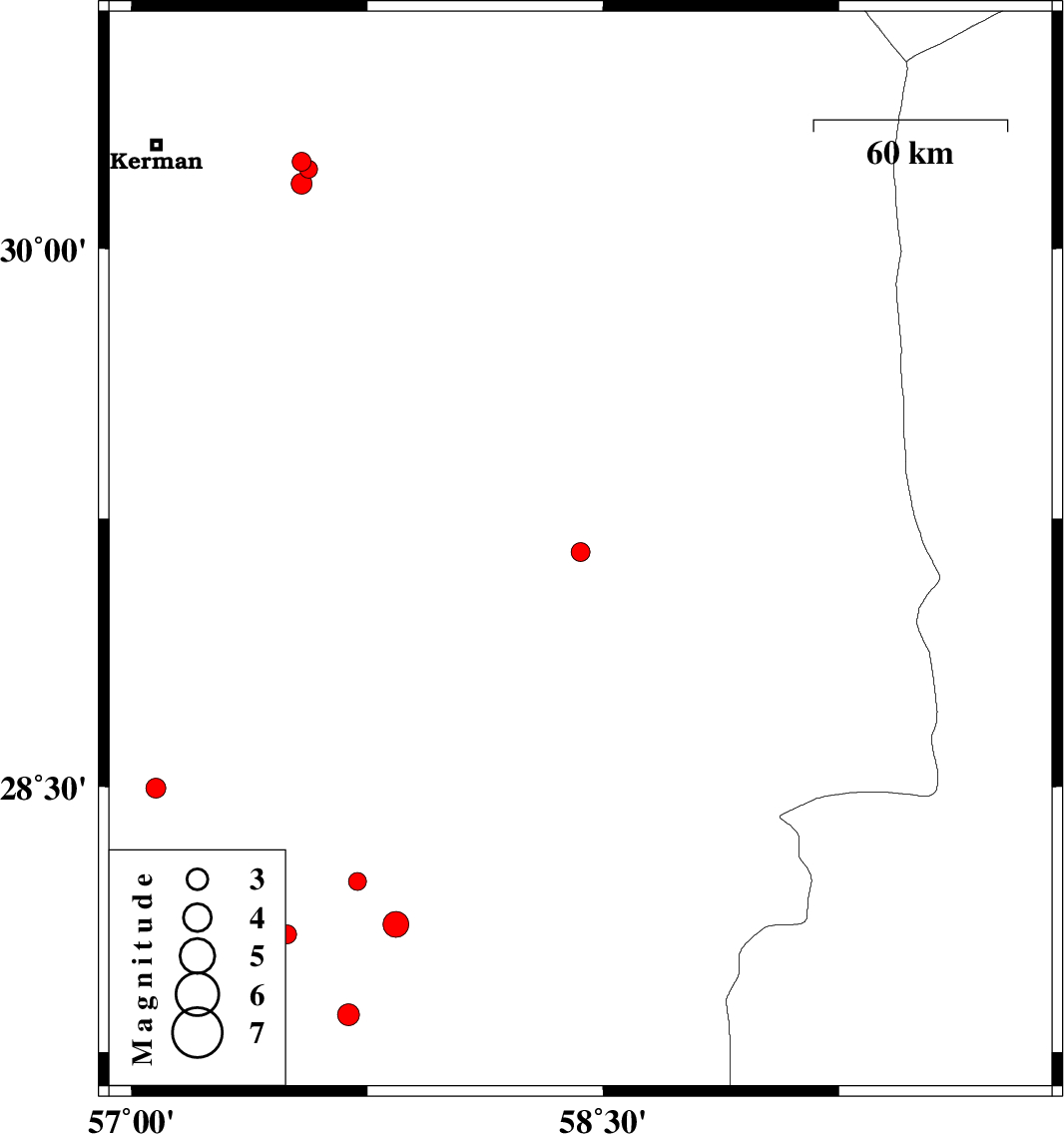 | 2016/09/07 | 09:39:13.3 | 14:09:13.3 | 30.179 | 57.541 | 14 | ML2.9 | Kerman Province, 46 km South-East of Kerman |