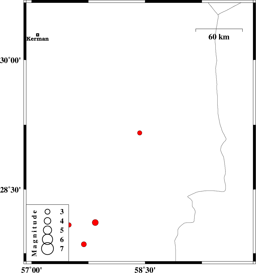 | 2016/10/01 | 04:19:18.8 | 07:49:18.8 | 28.111 | 57.841 | 14 | ML3.6 | Kerman Province, 23 km North-East of Kahnuj |