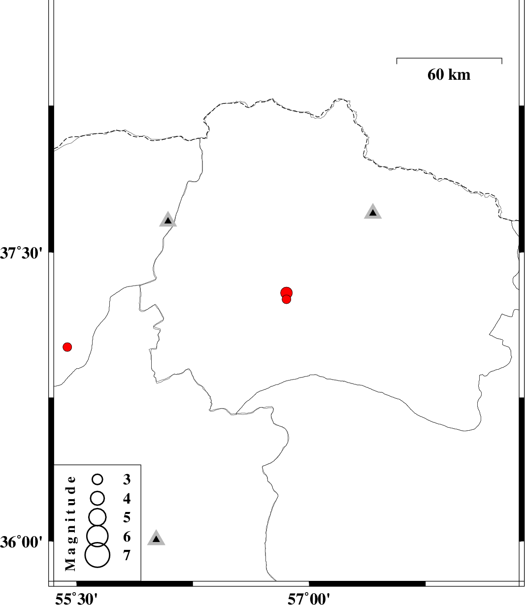 | 2016/10/04 | 13:16:18.5 | 16:46:18.5 | 37.258 | 56.853 | 15 | ML2.6 | Khorasan(north) Province, 33 km South of Ashkhaneh | ||