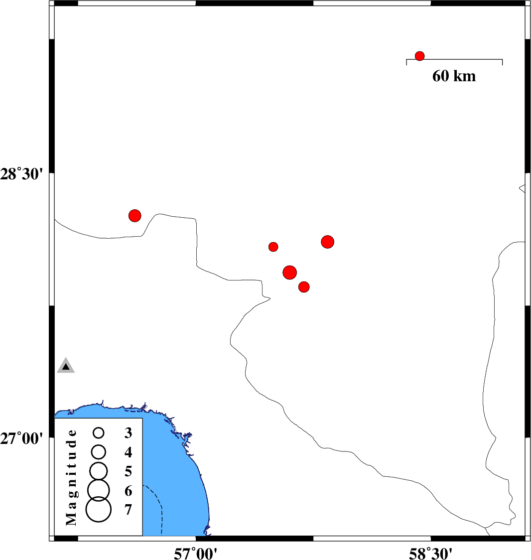 | 2016/10/08 | 05:58:59.9 | 09:28:59.9 | 27.937 | 57.599 | 15 | ML4 | Kerman Province, 9 km of Kahnuj | ||