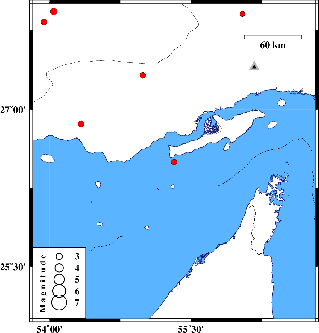 | 2016/10/09 | 02:21:58.2 | 05:51:58.2 | 26.501 | 55.32 | 15 | ML2.7 | Persian Gulf, 47 km -East of Bandar-e lengeh | ||