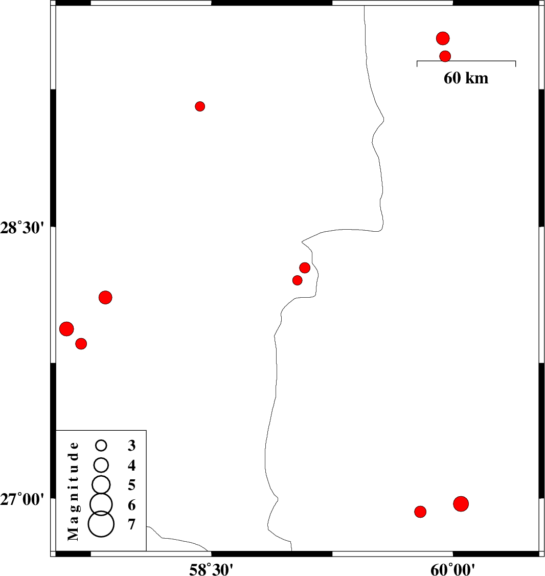 2016/10/08 | 05:58:59.9 | 09:28:59.9 | 27.937 | 57.599 | 15 | ML4 | Kerman Province, 9 km of Kahnuj | ||