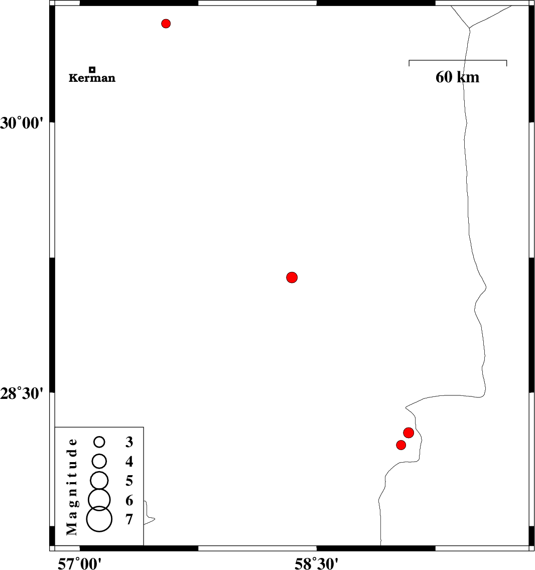 | 2016/10/14 | 02:46:59.5 | 06:16:59.5 | 28.274 | 59.08 | 15 | ML2.9 | Kerman Province, 117 km South-East of Bam | ||