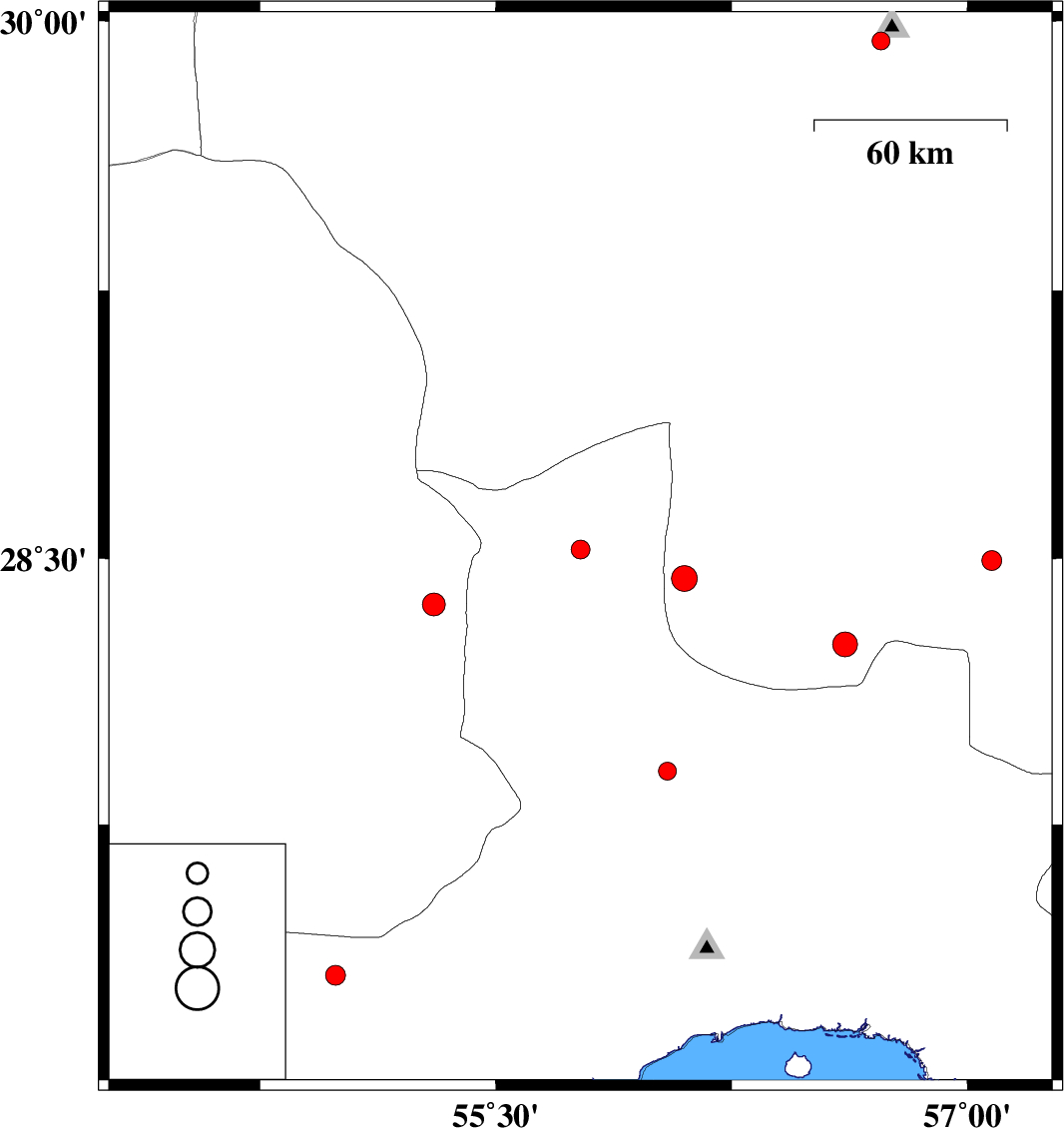 | 2016/10/01 | 08:20:17.3 | 11:50:17.3 | 28.259 | 56.611 | 14 | ML3.5 | Kerman Province, 70 km -East of Hajiabad | ||