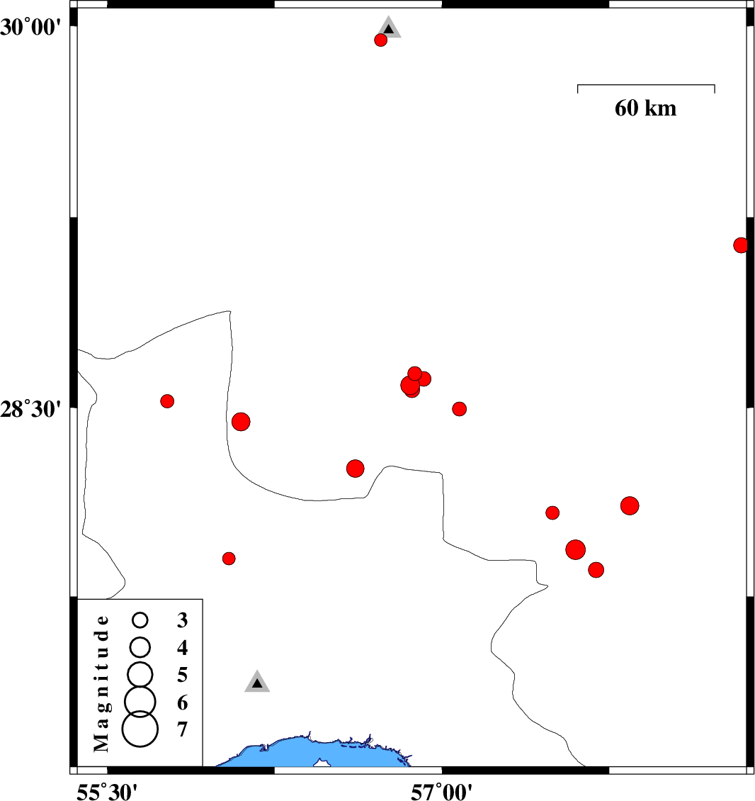 | 2016/10/08 | 05:58:59.9 | 09:28:59.9 | 27.937 | 57.599 | 15 | ML4 | Kerman Province, 9 km of Kahnuj | ||