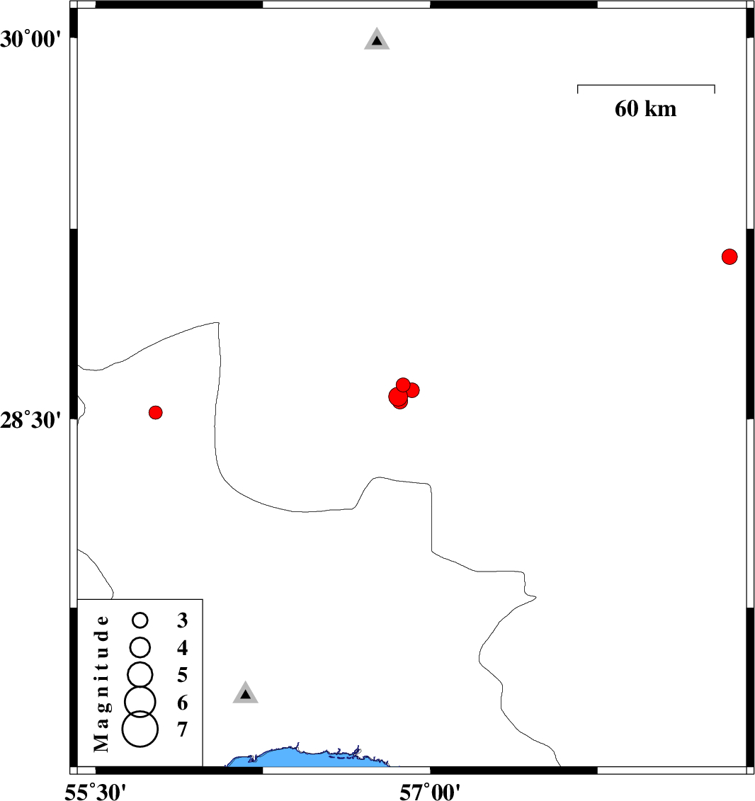 | 2016/10/22 | 05:46:49.8 | 09:16:49.8 | 28.614 | 56.918 | 14 | ML3 | Kerman Province, 80 km -West of Jiroft | ||
