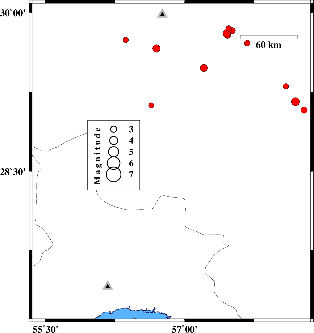 | 2016/10/08 | 05:58:59.9 | 09:28:59.9 | 27.937 | 57.599 | 15 | ML4 | Kerman Province, 9 km of Kahnuj | ||