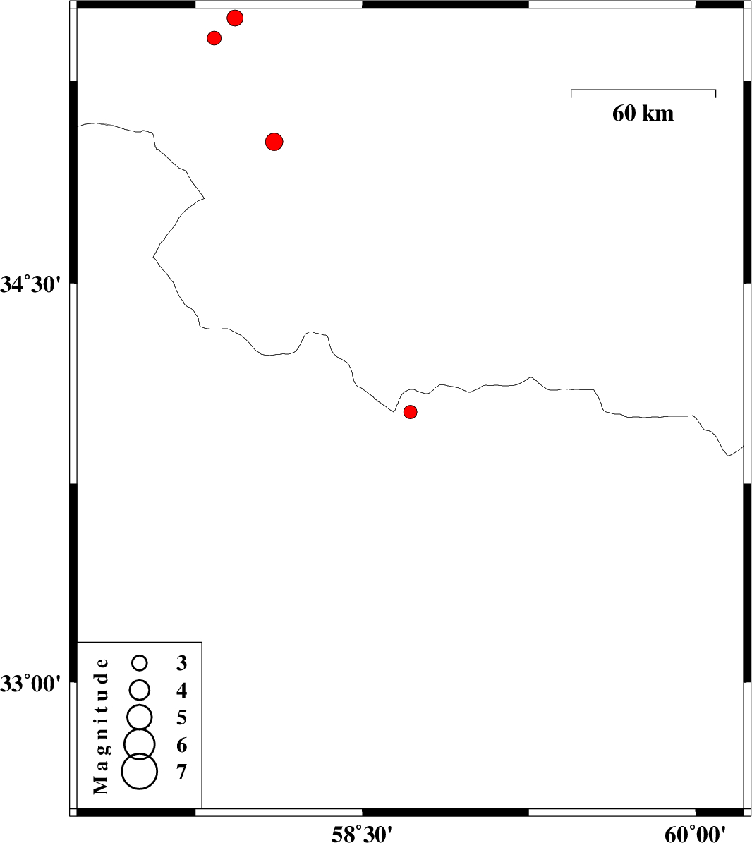 | 2016/09/29 | 03:36:54.3 | 07:06:54.3 | 35.408 | 57.833 | 14 | ML2.8 | Khorasan(center) Province, 20 km North-West of Bardeskan |