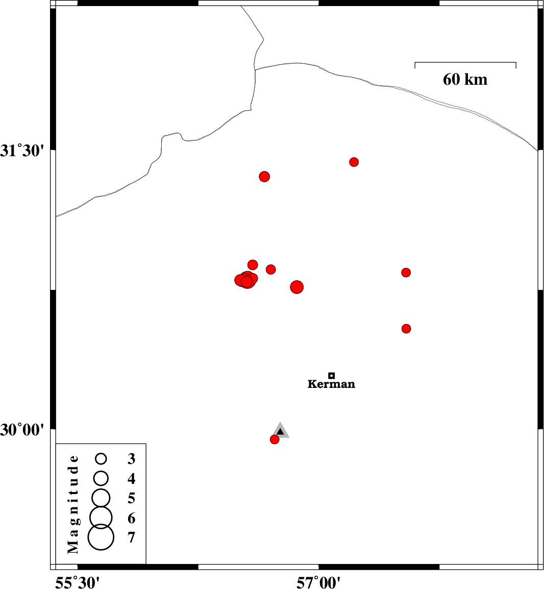| 2016/10/09 | 14:17:55.0 | 17:47:55.0 | 29.944 | 56.725 | 14 | ML2.5 | Kerman Province, 15 km -East of Bardsir | ||