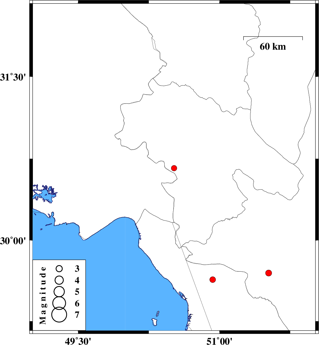 | 2016/10/21 | 05:19:06.1 | 08:49:06.1 | 29.697 | 51.522 | 15 | ML3 | Fars Province, 15 km -West of Kazerun |