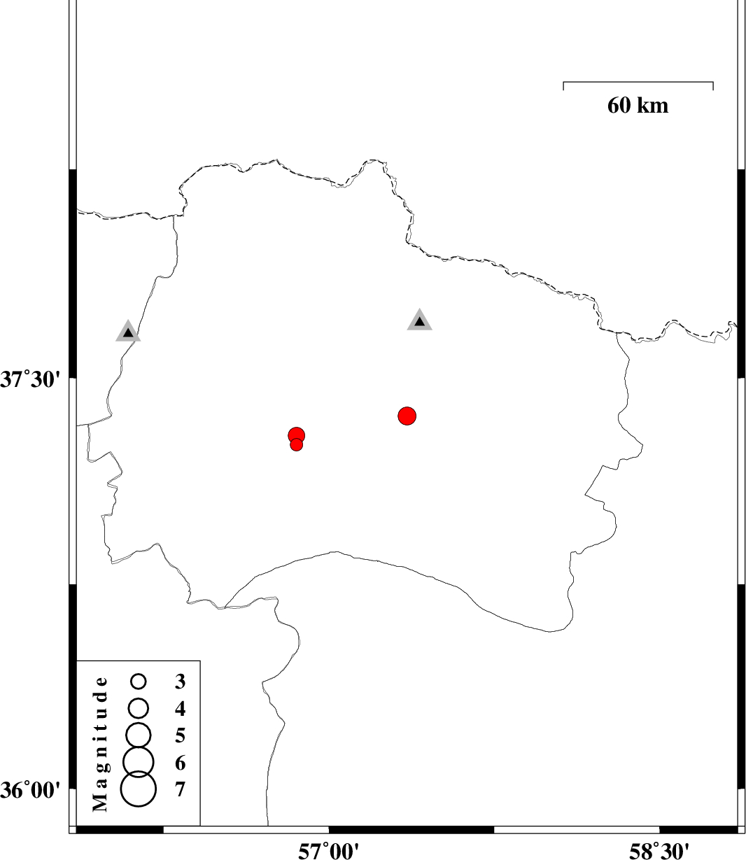 | 2016/11/02 | 23:23:05.4 | 02:53:05.4 | 37.362 | 57.354 | 15 | ML3.6 | Khorasan(north) Province, 12 km South of Bojnurd | ||