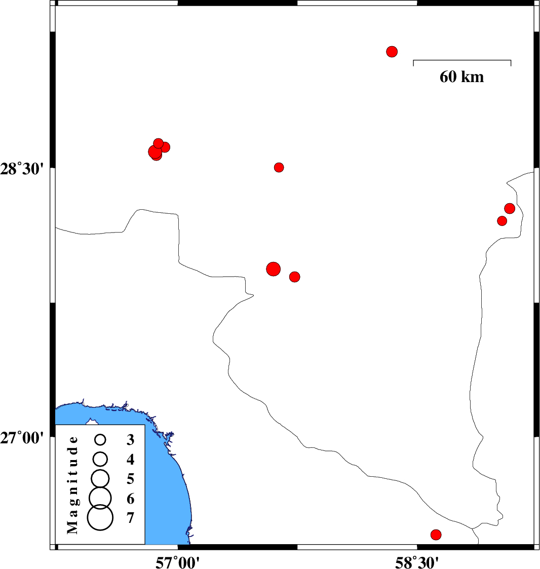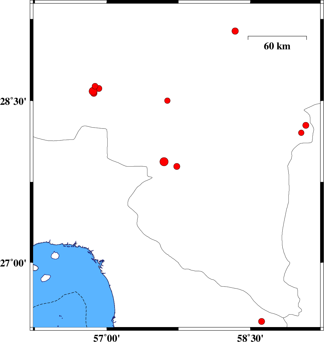 | 2016/10/08 | 05:58:59.9 | 09:28:59.9 | 27.937 | 57.599 | 15 | ML4 | Kerman Province, 9 km of Kahnuj |