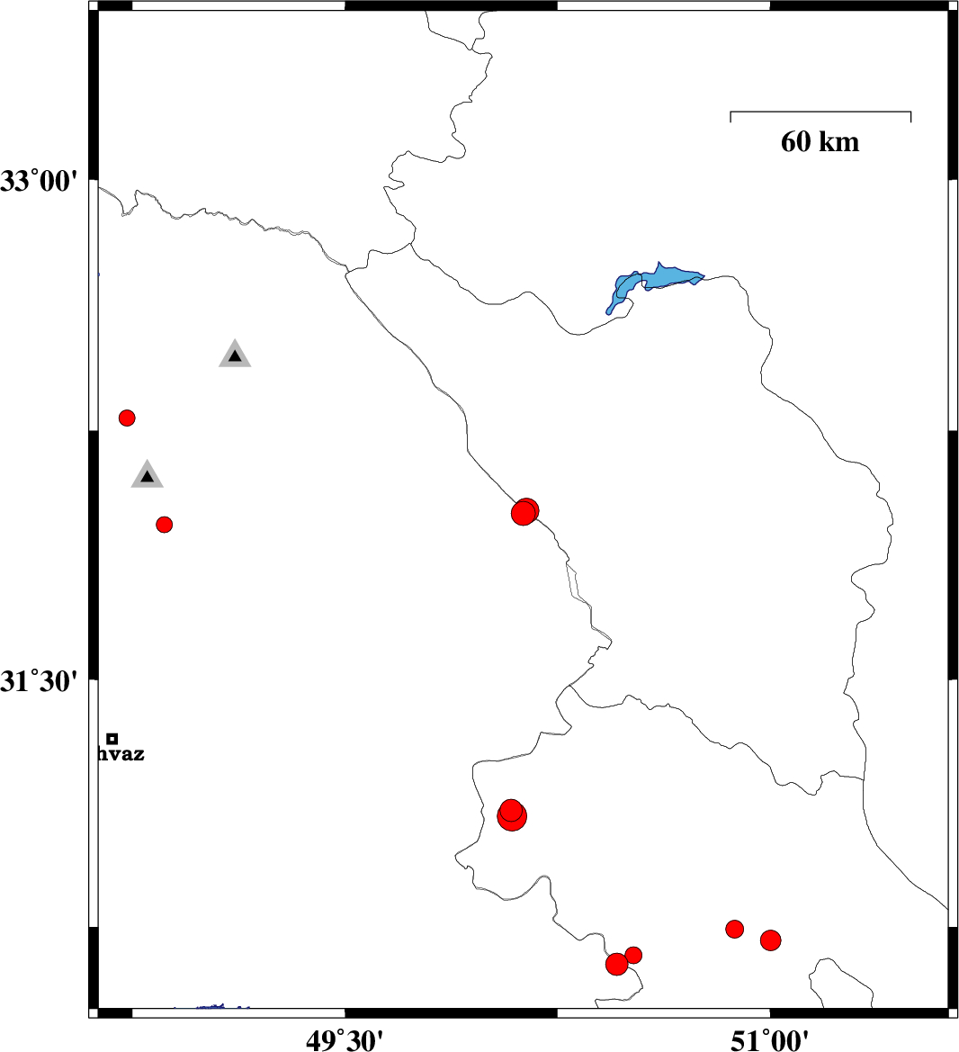 | 2016/10/23 | 13:30:55.6 | 17:00:55.6 | 32.287 | 48.73 | 18 | ML2.6 | Khoozestan Province, 30 km North-West of Shushtar | ||