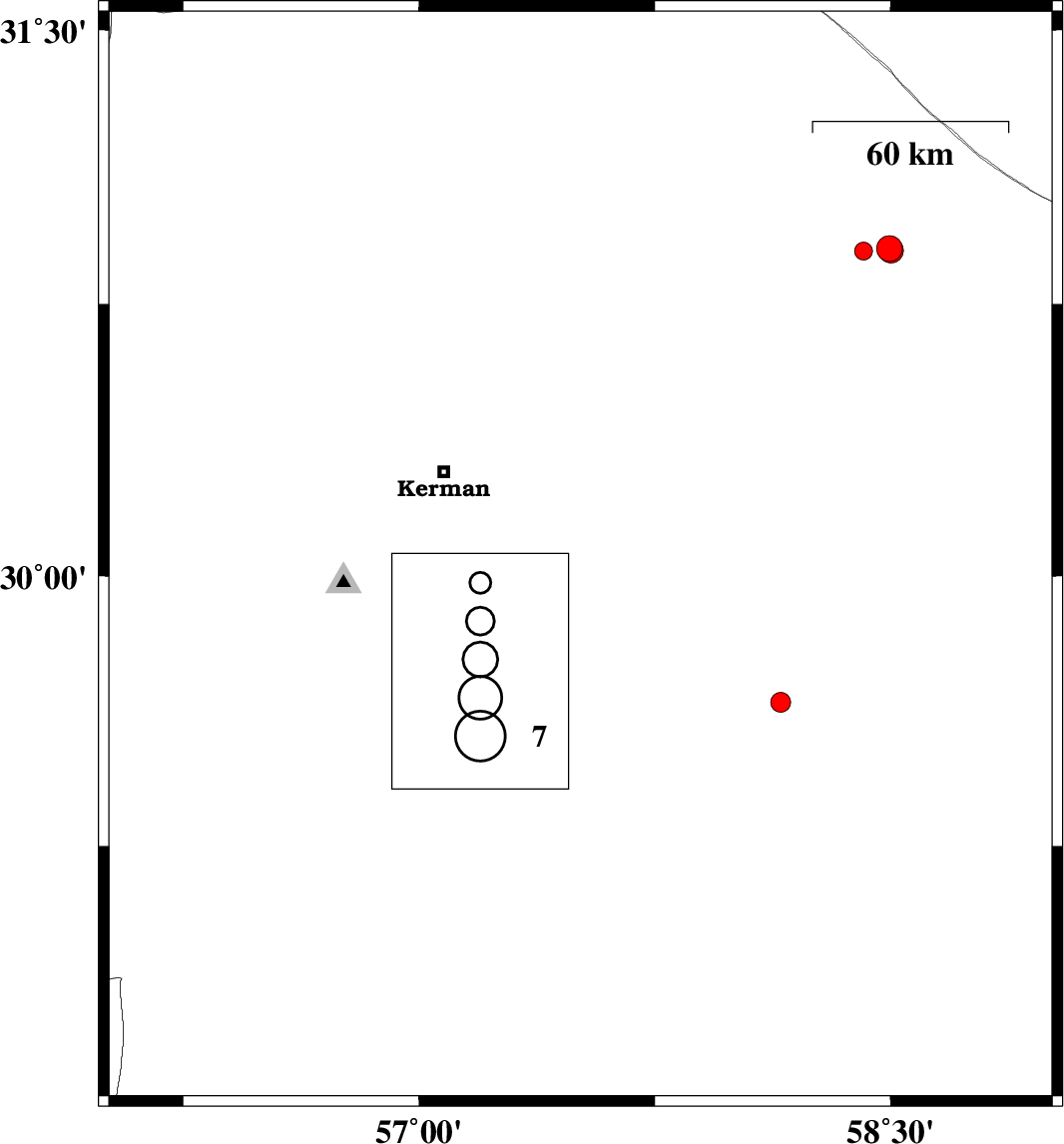 | 2016/11/10 | 15:20:09.5 | 18:50:09.5 | 30.058 | 57.597 | 7 | ML3.6 | Kerman Province, 56 km South-East of Kerman | ||