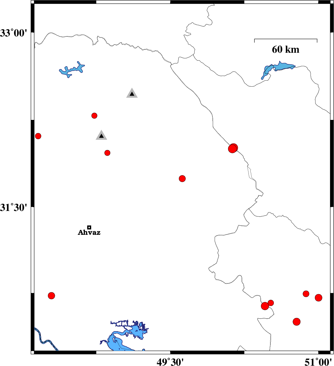 | 2016/10/23 | 13:30:55.6 | 17:00:55.6 | 32.287 | 48.73 | 18 | ML2.6 | Khoozestan Province, 30 km North-West of Shushtar |