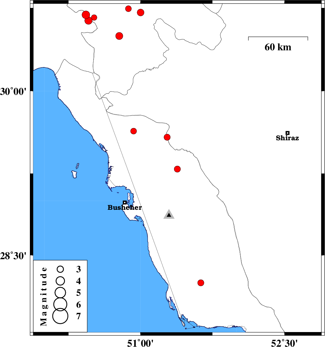 | 2016/11/17 | 21:27:49.3 | 00:57:49.3 | 29.581 | 51.278 | 6 | ML2.9 | Bushehr Province, 36 km North of Borazjan | ||