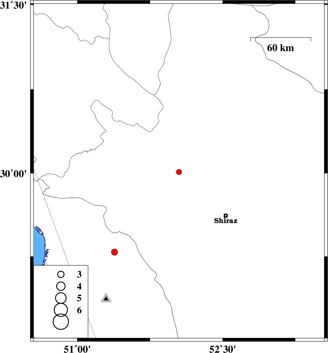 | 2016/11/23 | 23:33:27.6 | 03:03:27.6 | 29.29 | 51.384 | 6 | ML2.9 | Bushehr Province, 18 km -East of Borazjan |