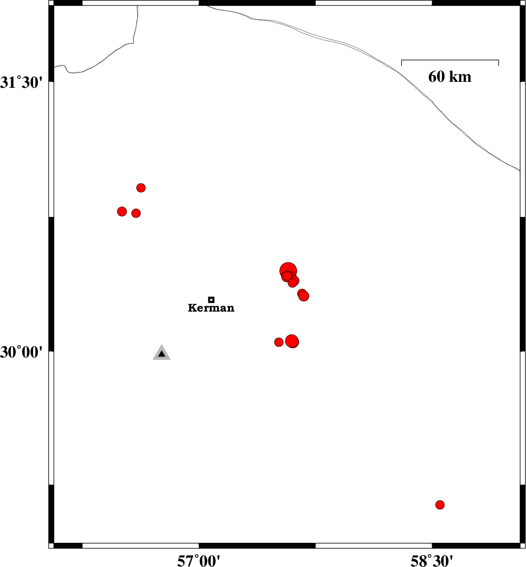 2016/12/01 | 09:21:42.7 | 12:51:42.7 | 30.449 | 57.574 | 14 | ML5 | Kerman Province, 51 km North-East of Kerman | ||