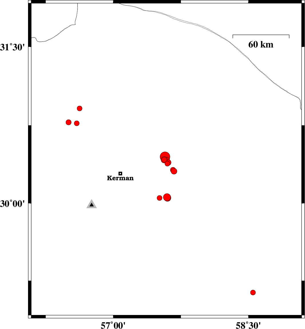 2016/12/01 | 09:21:42.7 | 12:51:42.7 | 30.449 | 57.574 | 14 | ML5 | Kerman Province, 51 km North-East of Kerman | ||