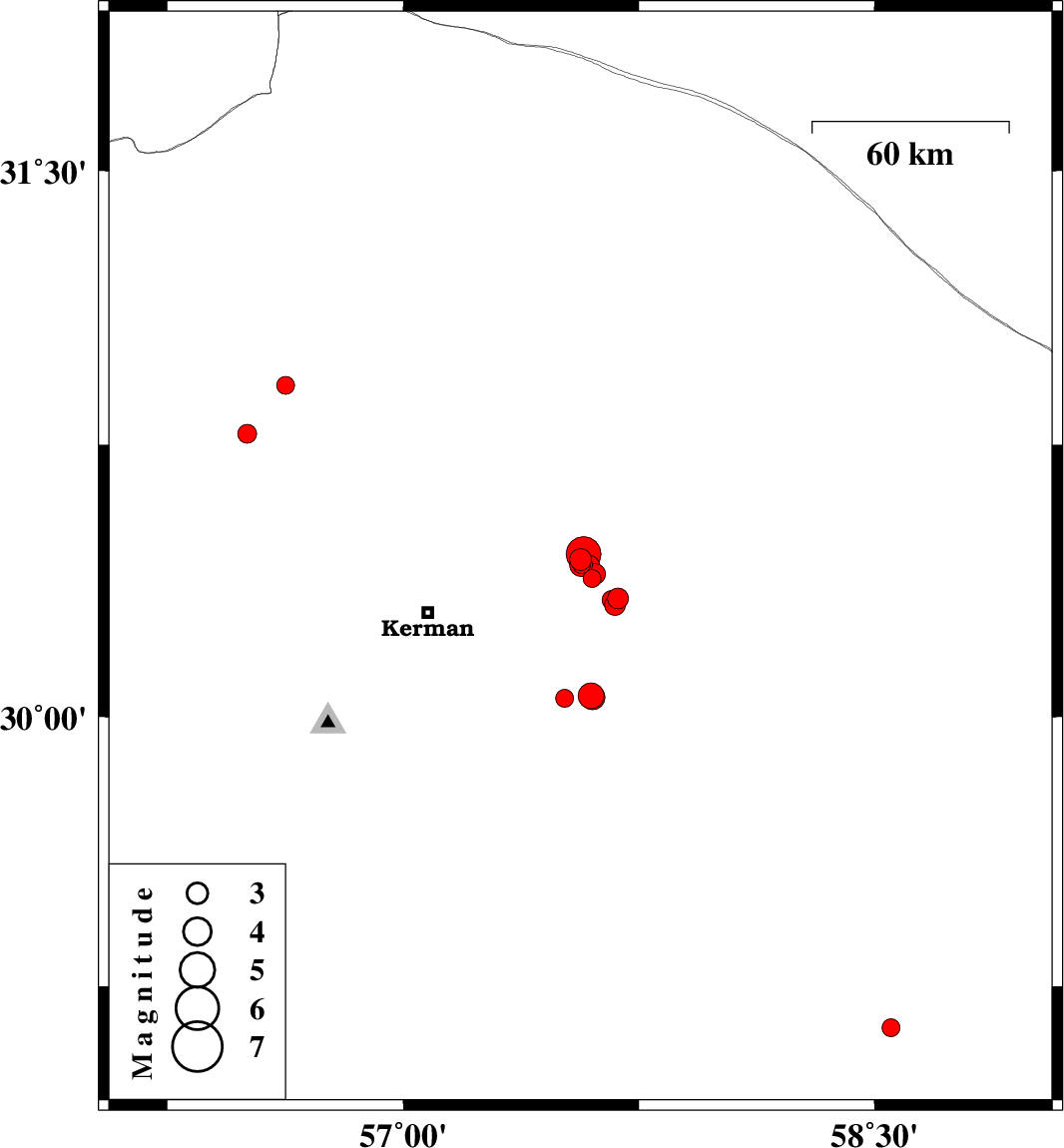 2016/11/10 | 15:20:09.5 | 18:50:09.5 | 30.058 | 57.597 | 7 | ML3.6 | Kerman Province, 56 km South-East of Kerman | ||