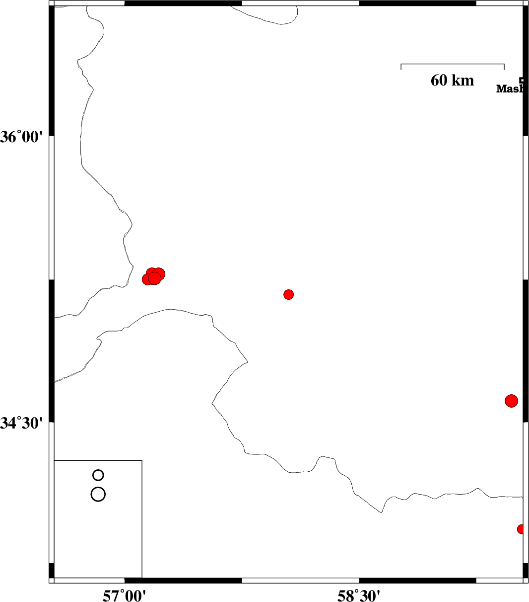 | 2016/11/15 | 04:00:27.5 | 07:30:27.5 | 35.251 | 57.147 | 14 | ML3.2 | Khorasan(center) Province, 73 km -West of Bardeskan | ||
