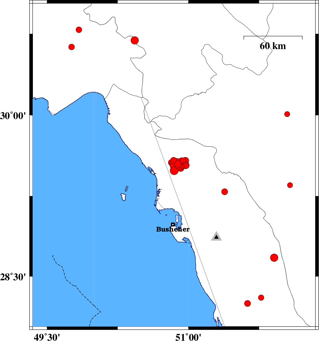 2016/12/18 21:29:10.7 00:59:10.7 29.52550.92615 ML2.8 Bushehr Province, 40 km -East of Bandar-e genaveh