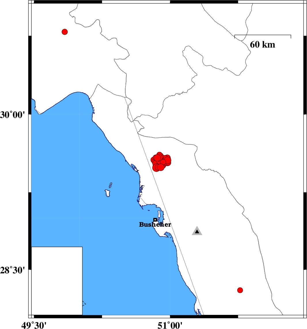 | 2016/12/19 | 02:43:19.9 | 06:13:19.9 | 29.491 | 50.871 | 15 | ML3.1 | Bushehr Province, 36 km -East of Bandar-e genaveh | ||