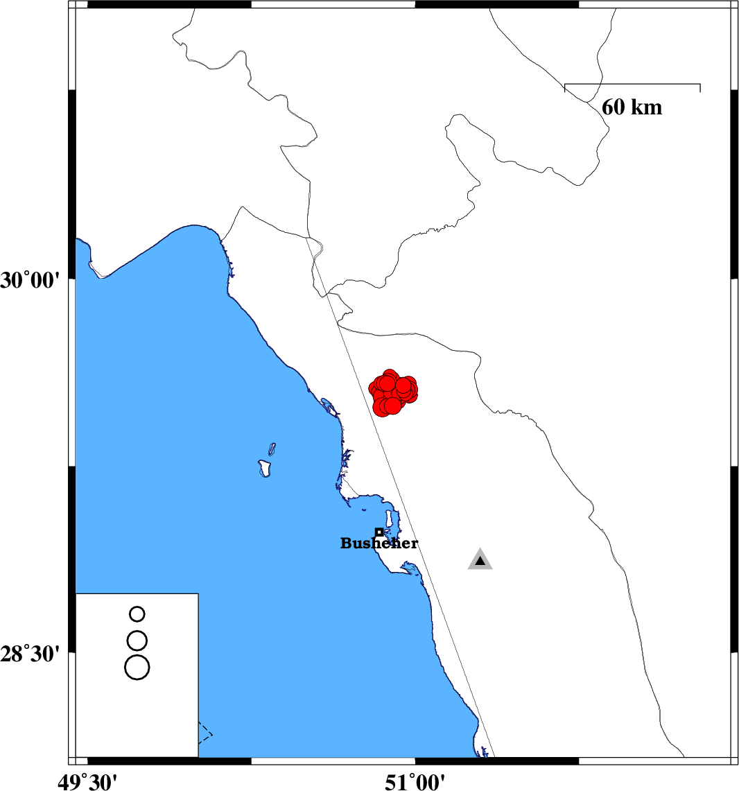 | 2016/12/19 | 16:30:37.7 | 20:00:37.7 | 29.611 | 50.884 | 6 | ML2.8 | Bushehr Province, 36 km -East of Bandar-e genaveh | ||
