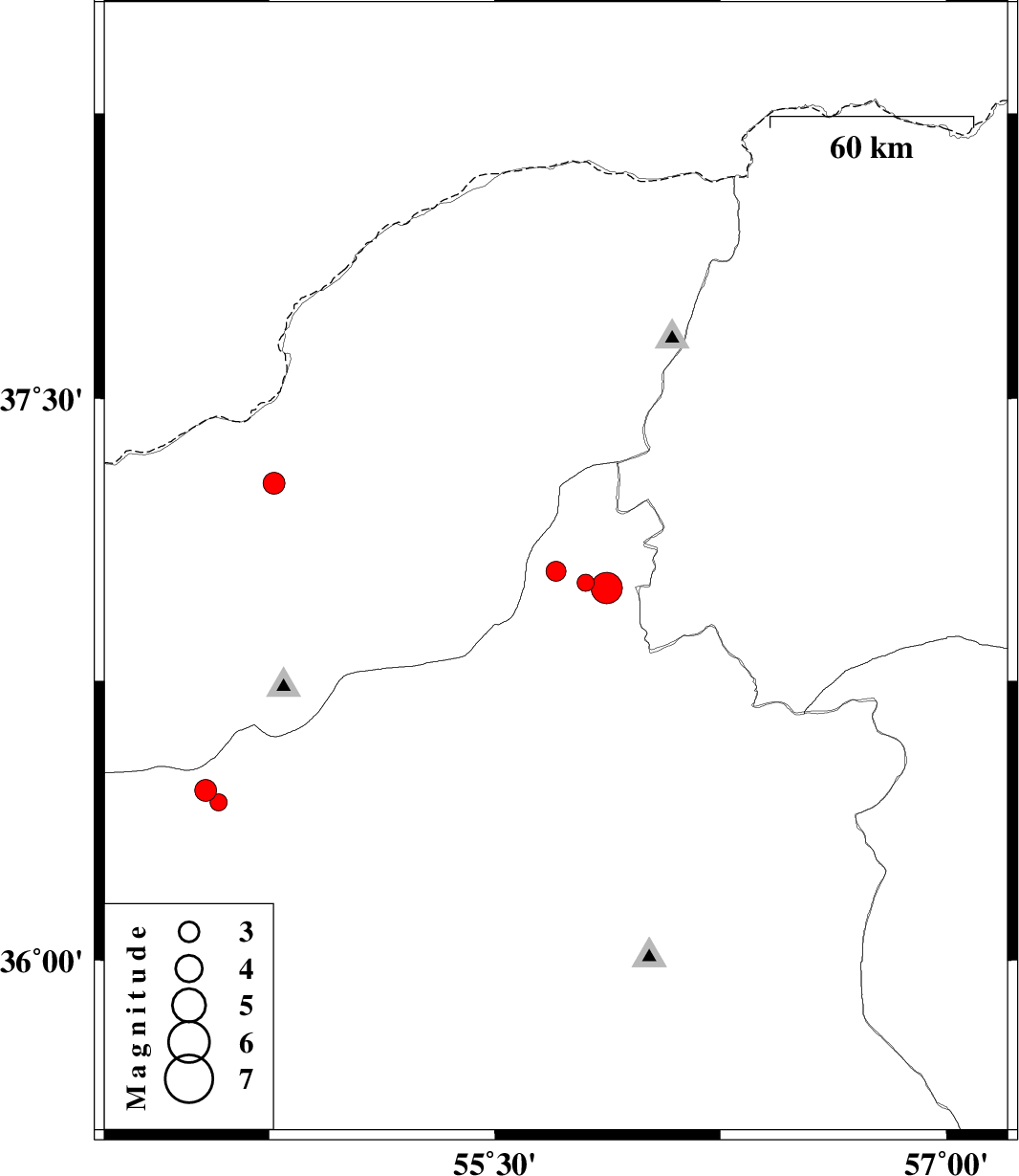 | 2016/12/27 | 20:56:19.6 | 00:26:19.6 | 36.997 | 55.871 | 6 | ML4.6 | Semnan Province, 46 km -West of Jajarm | ||