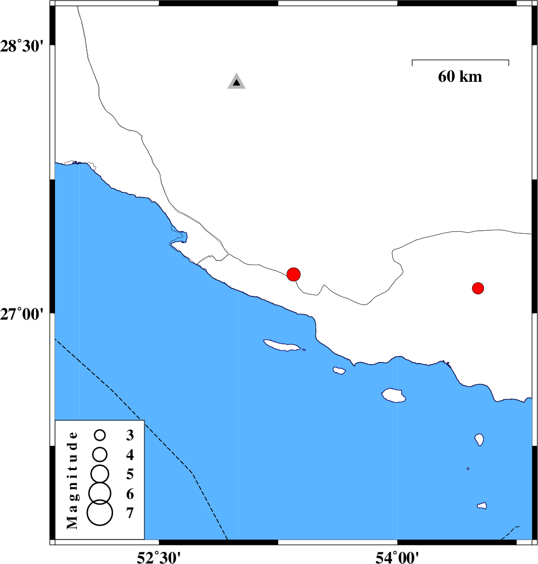 | 2016/12/30 | 19:47:37.1 | 23:17:37.1 | 27.217 | 53.346 | 15 | ML3.8 | Fars Province, 22 km South-East of Lamerd | ||