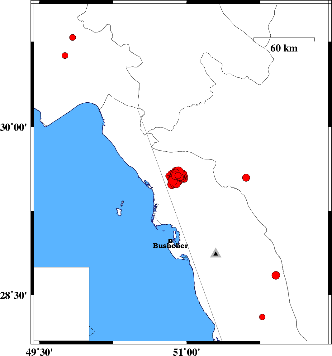 2017/01/02 01:11:45.6 04:41:45.6 29.59450.89116 ML3 Bushehr Province, 37 km -East of Bandar-e genaveh