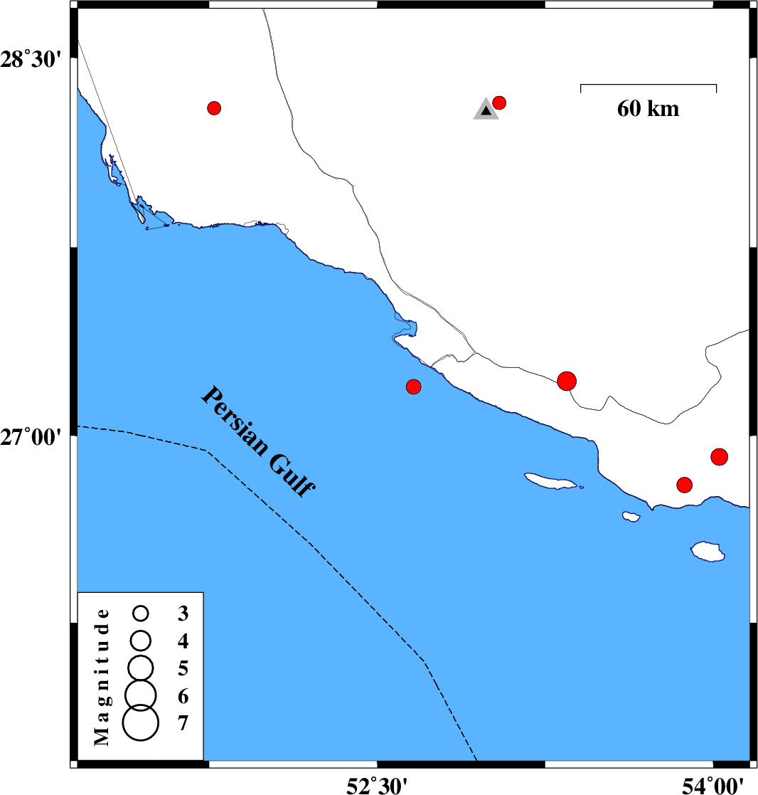 | 2016/12/13 | 18:44:11.1 | 22:14:11.1 | 28.3 | 51.772 | 22 | ML2.7 | Bushehr Province, 55 km South-East of Khormog | ||