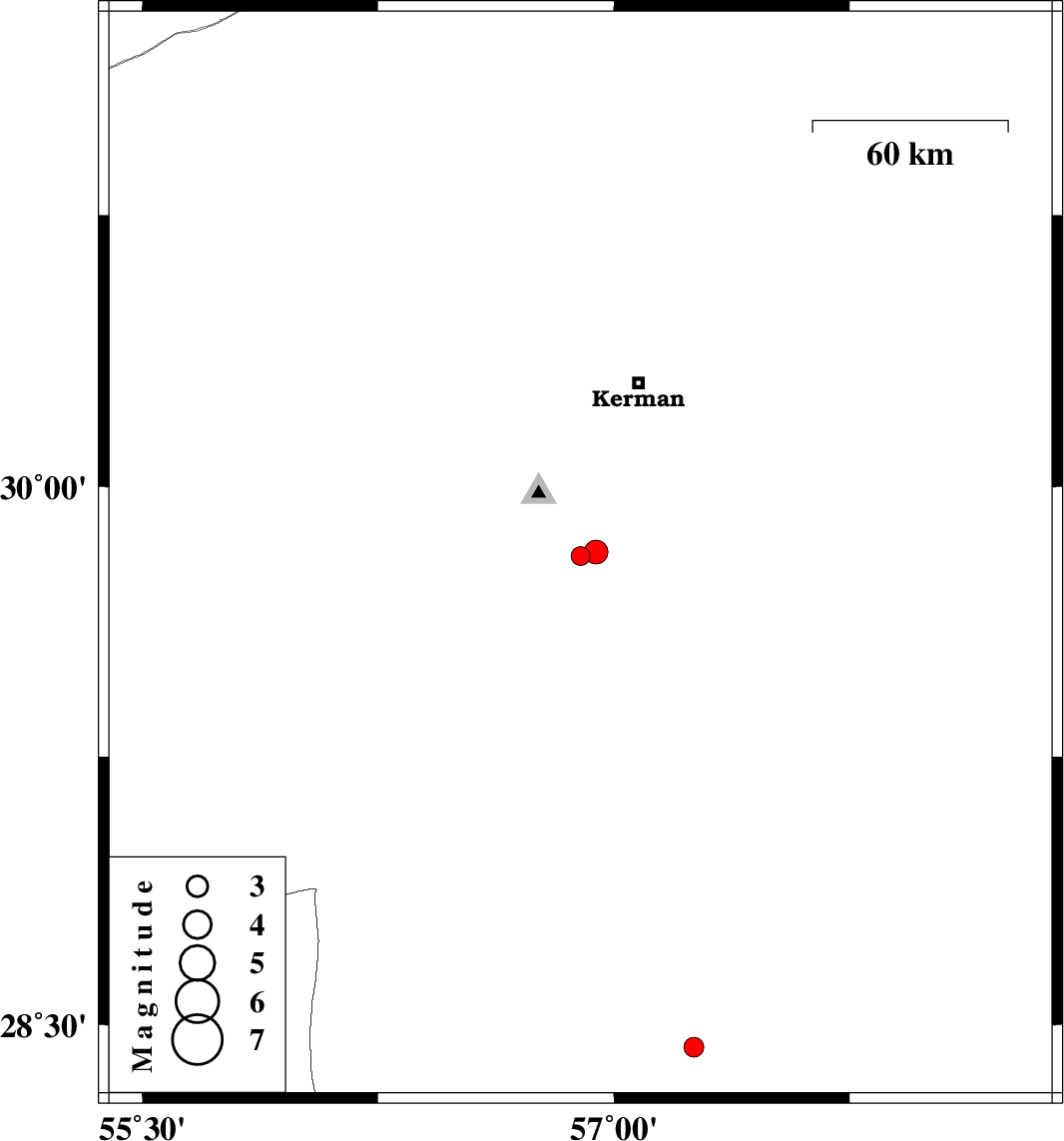 | 2017/01/04 | 17:57:49.1 | 21:27:49.1 | 28.437 | 57.254 | 16 | ML2.8 | Kerman Province, 54 km South-West of Jiroft |